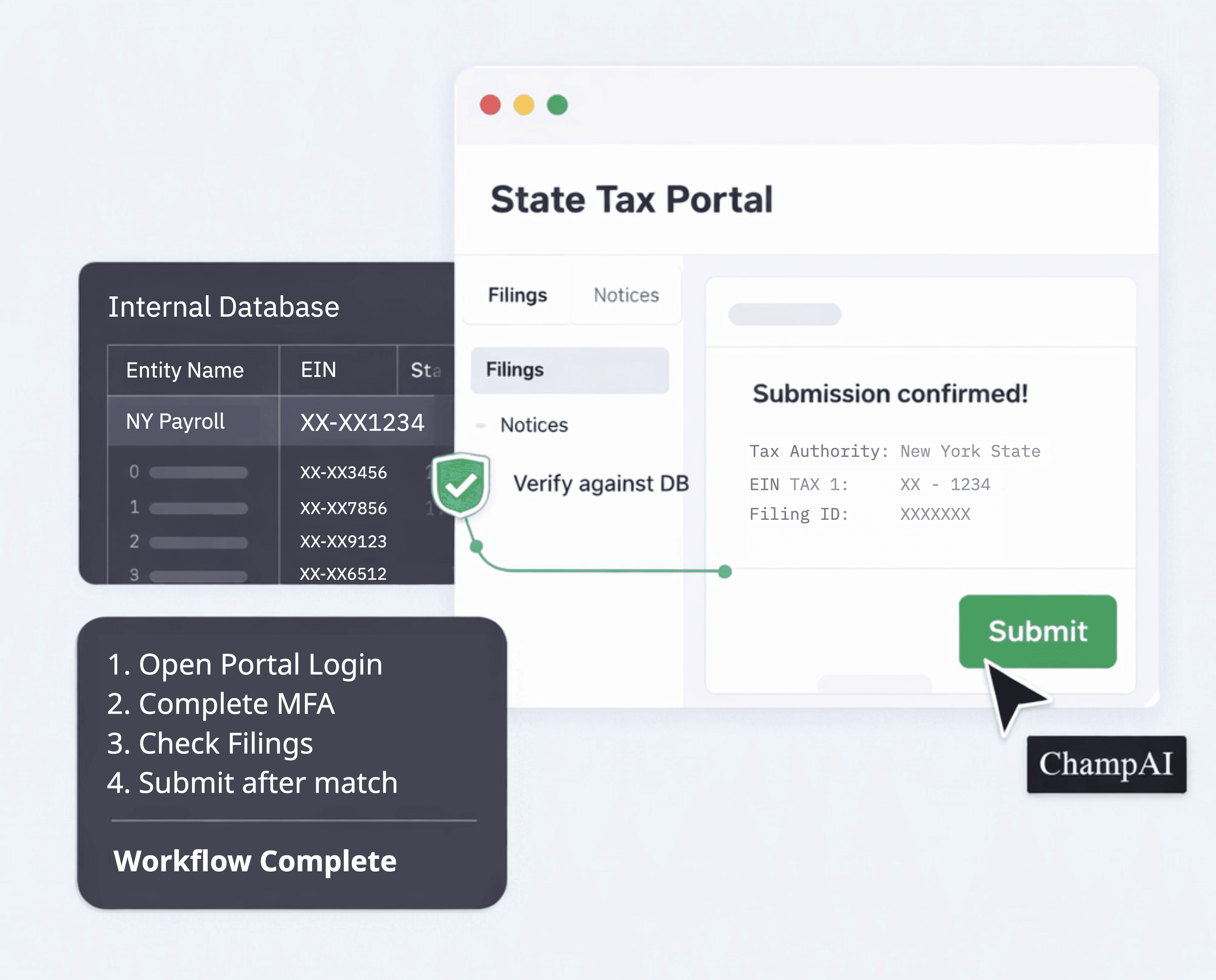 Bridge the gap between modern APIs and legacy web portals. ChampAI’s browser automation acts as a digital operator, navigating interfaces exactly like a human would. It handles the heavy lifting of manual web work, from logging into legacy portals and clearing MFA hurdles to scraping data from PDFs and notices. Everything done while validating information against your internal systems in real time.